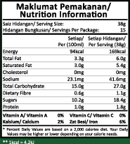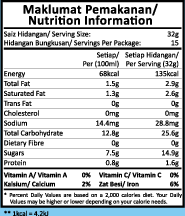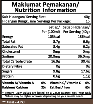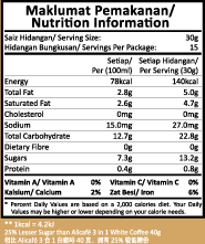 Non-Dairy Creamer [Glucose Syrup, Hydrogenated Vegetable Oil, Sodium Caseinate (Milk Protein), Stabilizer, Emulsifier, Anticaking Agent (E551)], Sugar, Instant Coffee Powder, Skimmed Milk Powder, Maltodextrin, Anticaking Agent (E551).